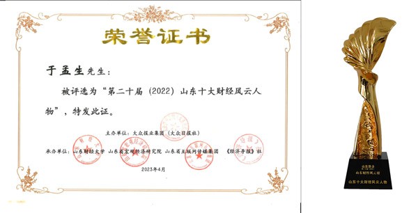 PT视讯(中国区)官网集团总裁于孟生荣膺“2022山东十大财经风云人物”